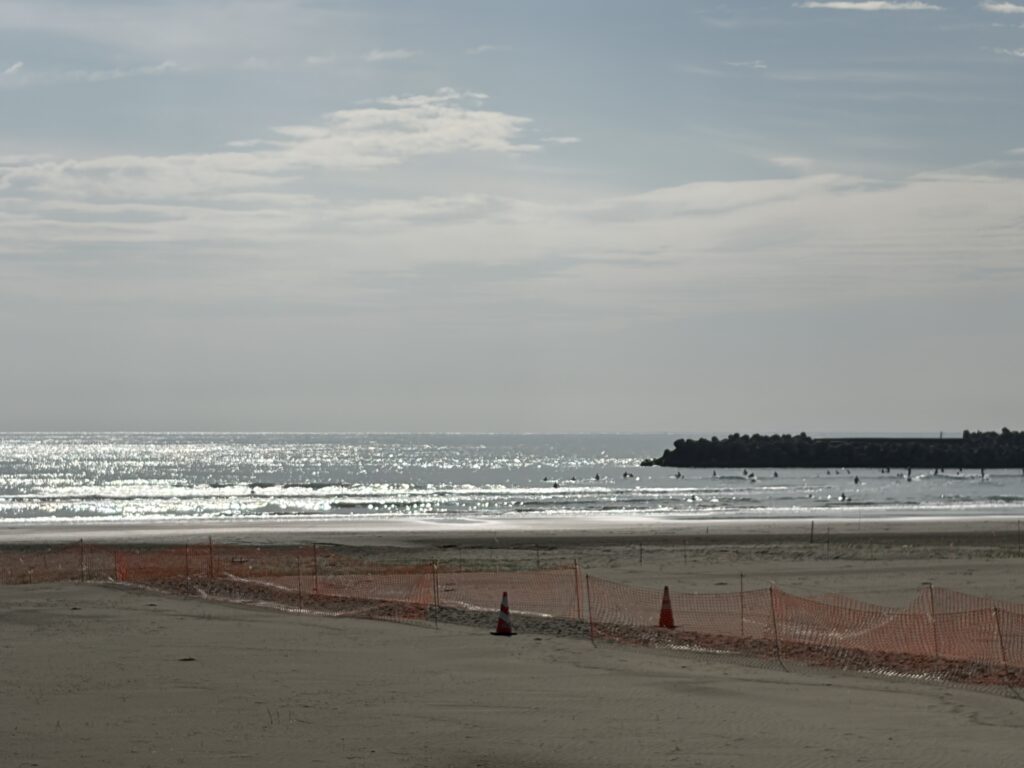 こちらも強いオフショアの影響を受けており、波は割れ辛そう。何とかサーフィンが出来そうで、5-6名しか入水しておらず、こんな環境は千葉ではまずありえないので、入ることにします。